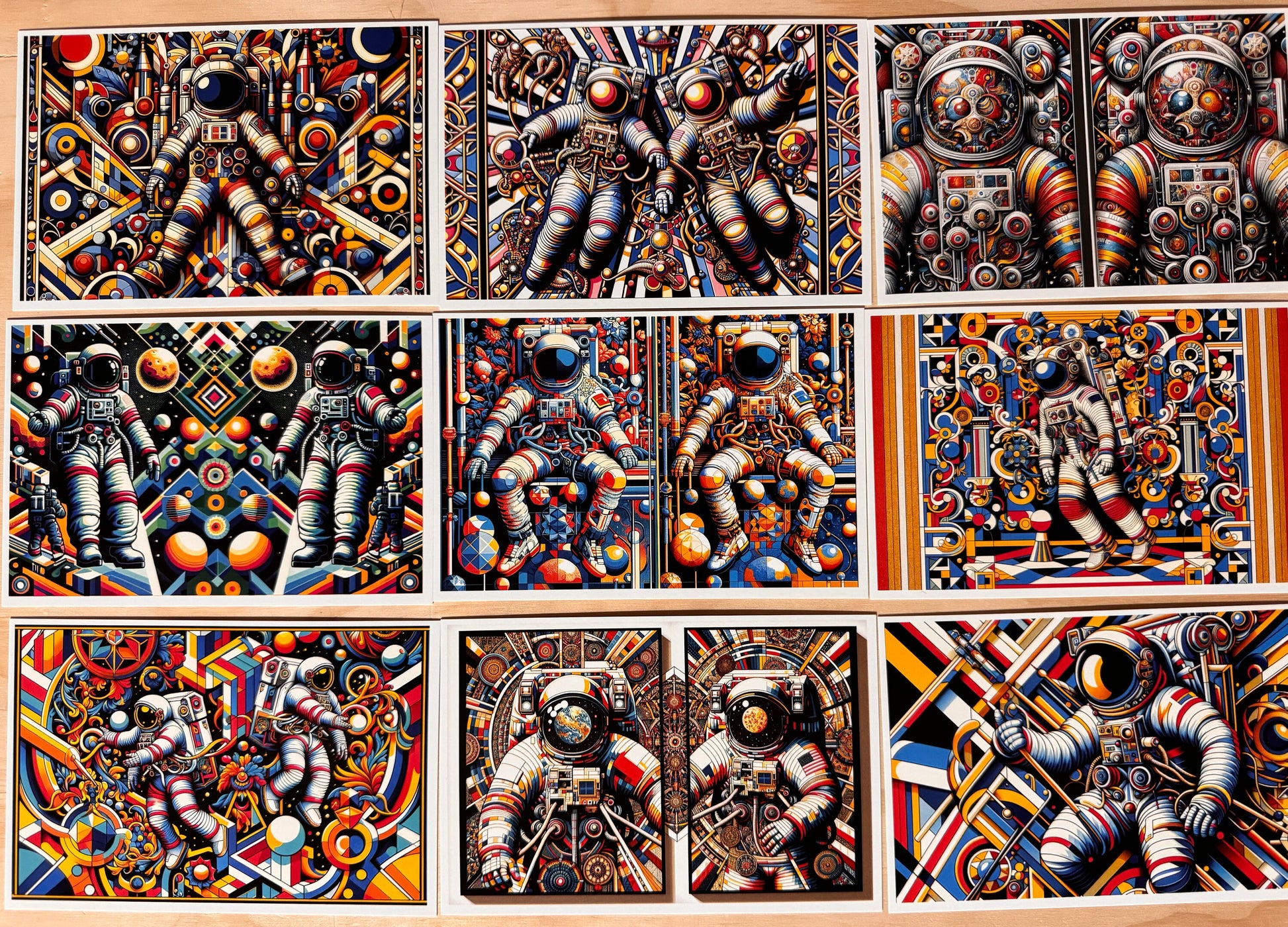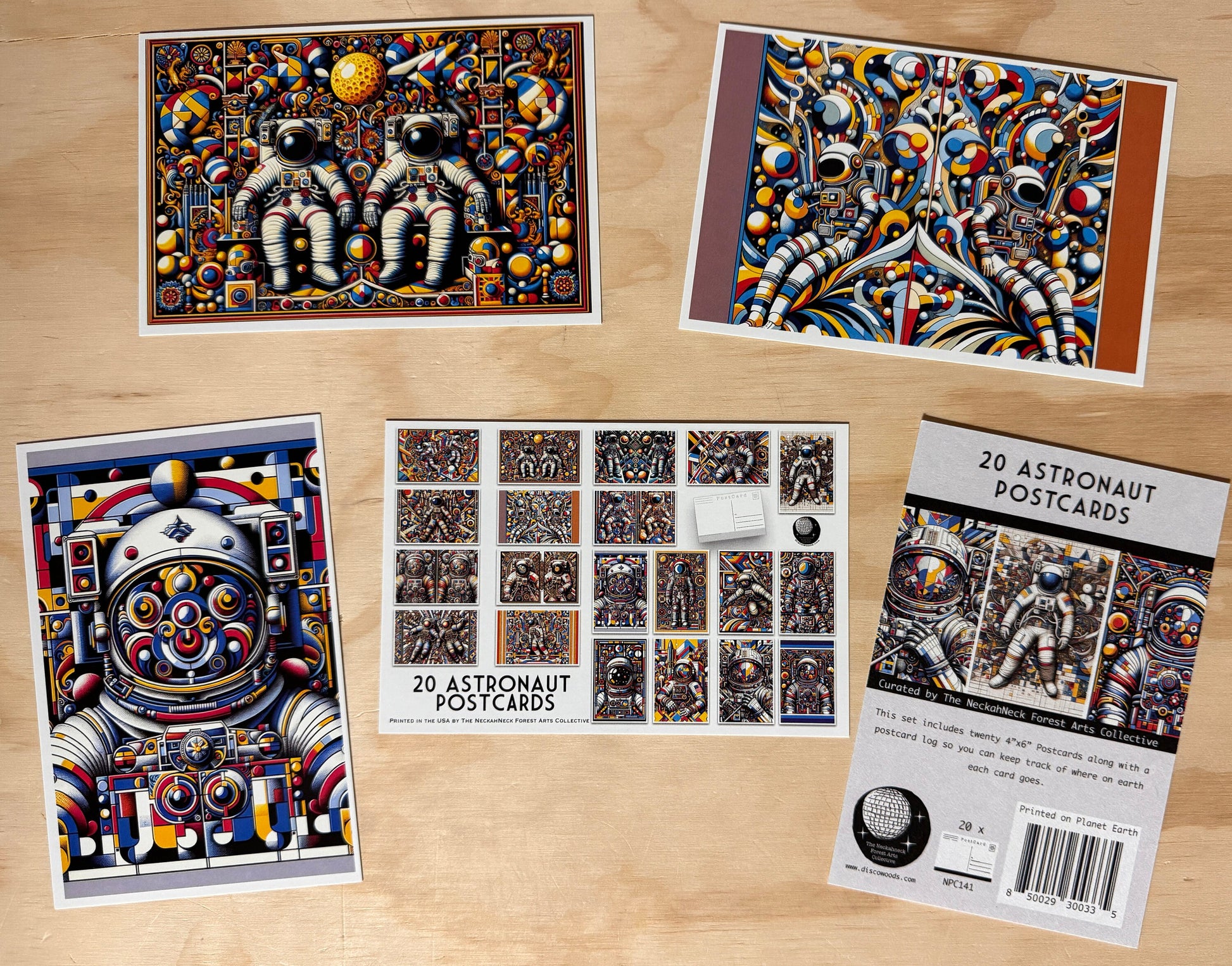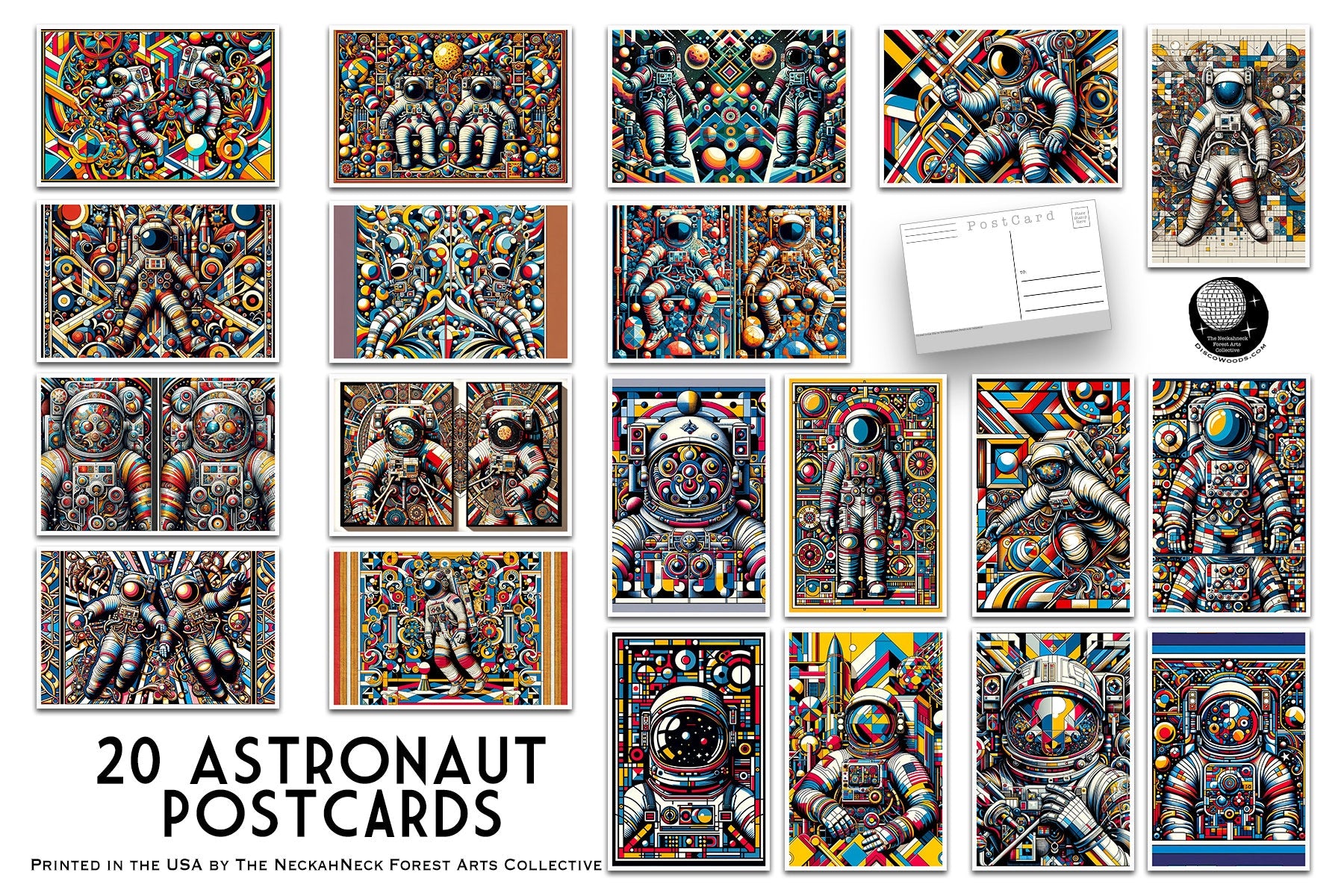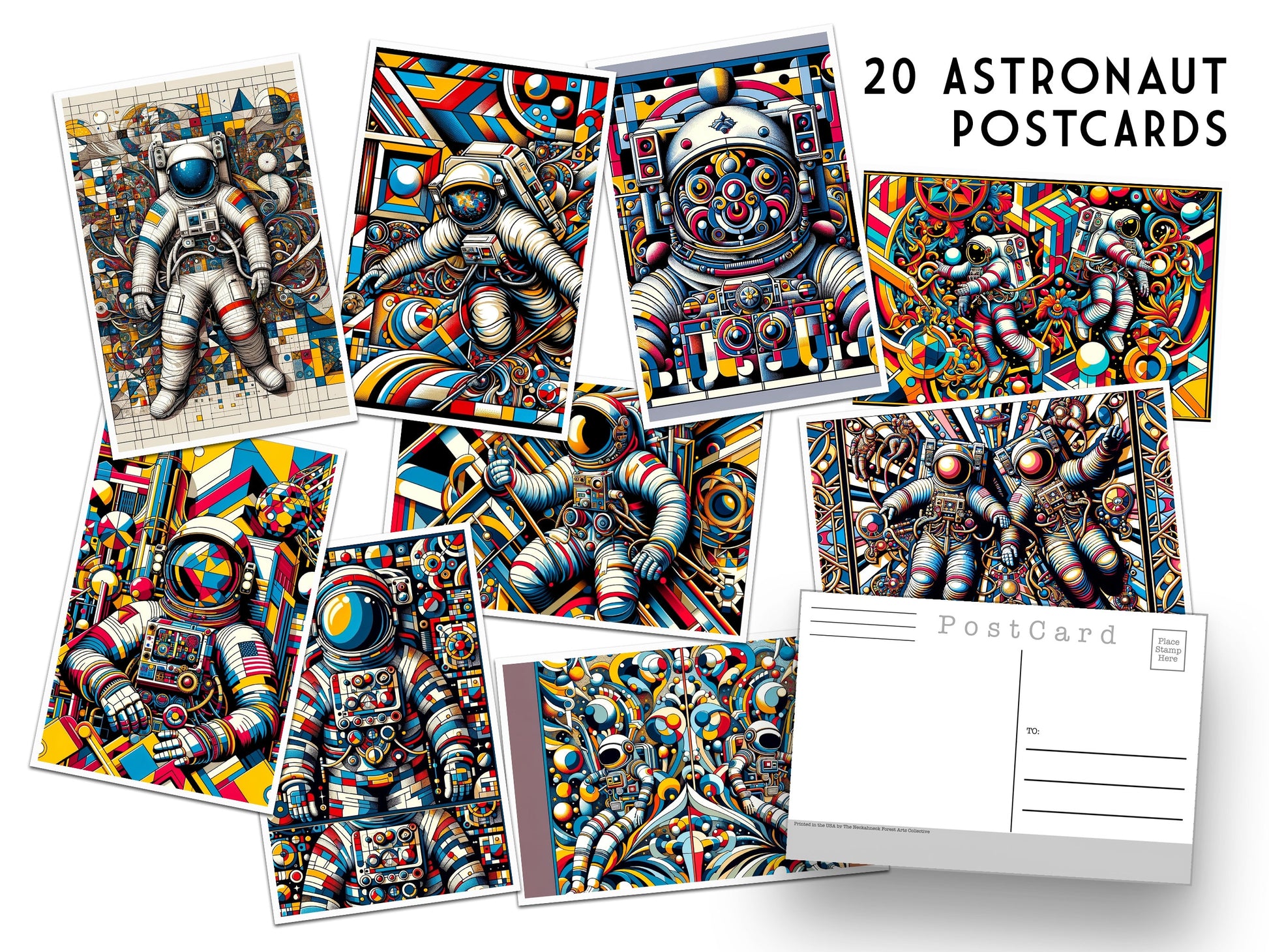 A set of 20 Astronaut Postcards. This set features postcards depicting Astronauts in a bright and colorful style - Outer Space Post Cards - NASA - Astronaut - JPL.