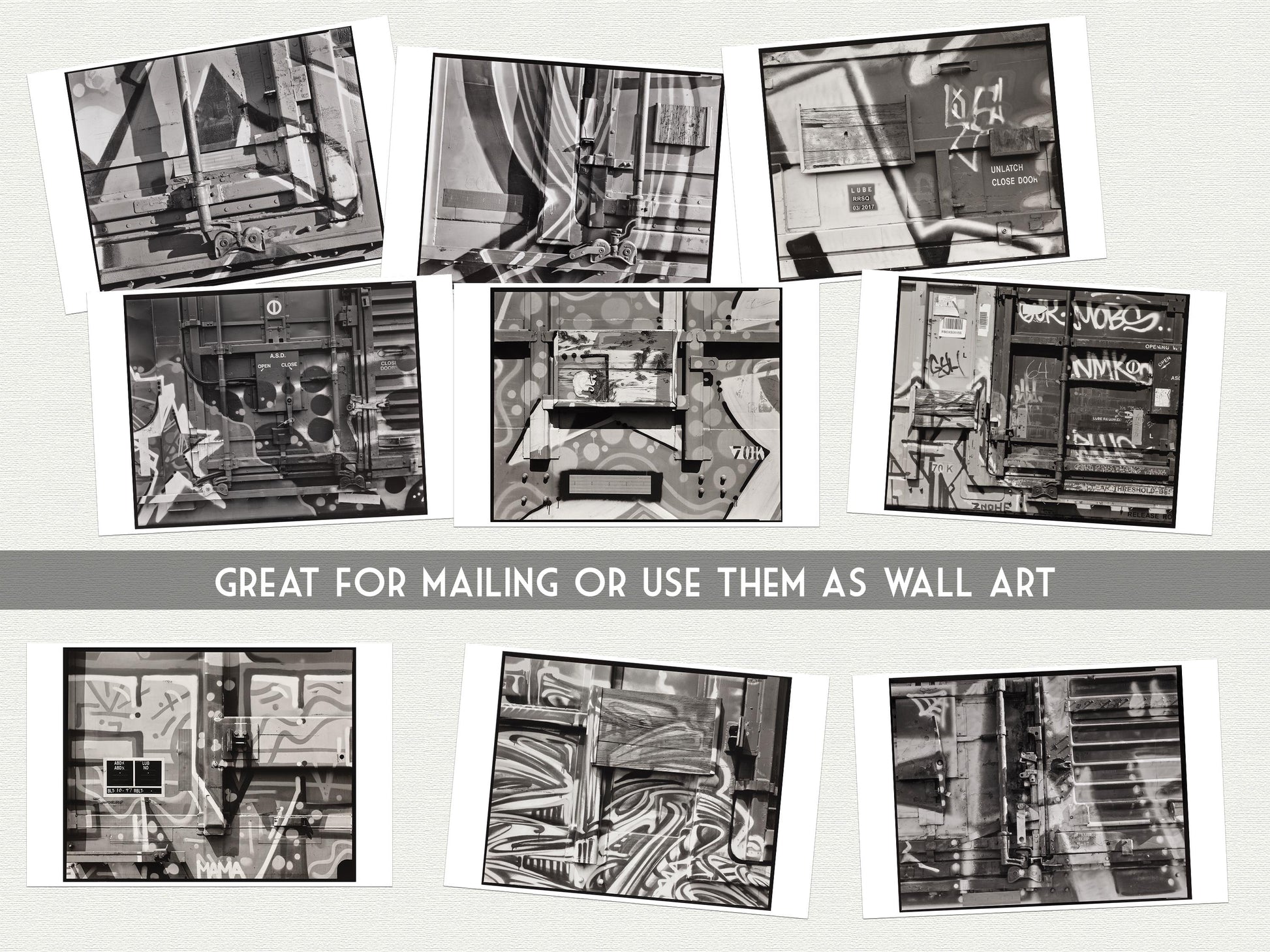 20 unique black-and-white designs, showcasing graffiti and industrial textures of boxcars.