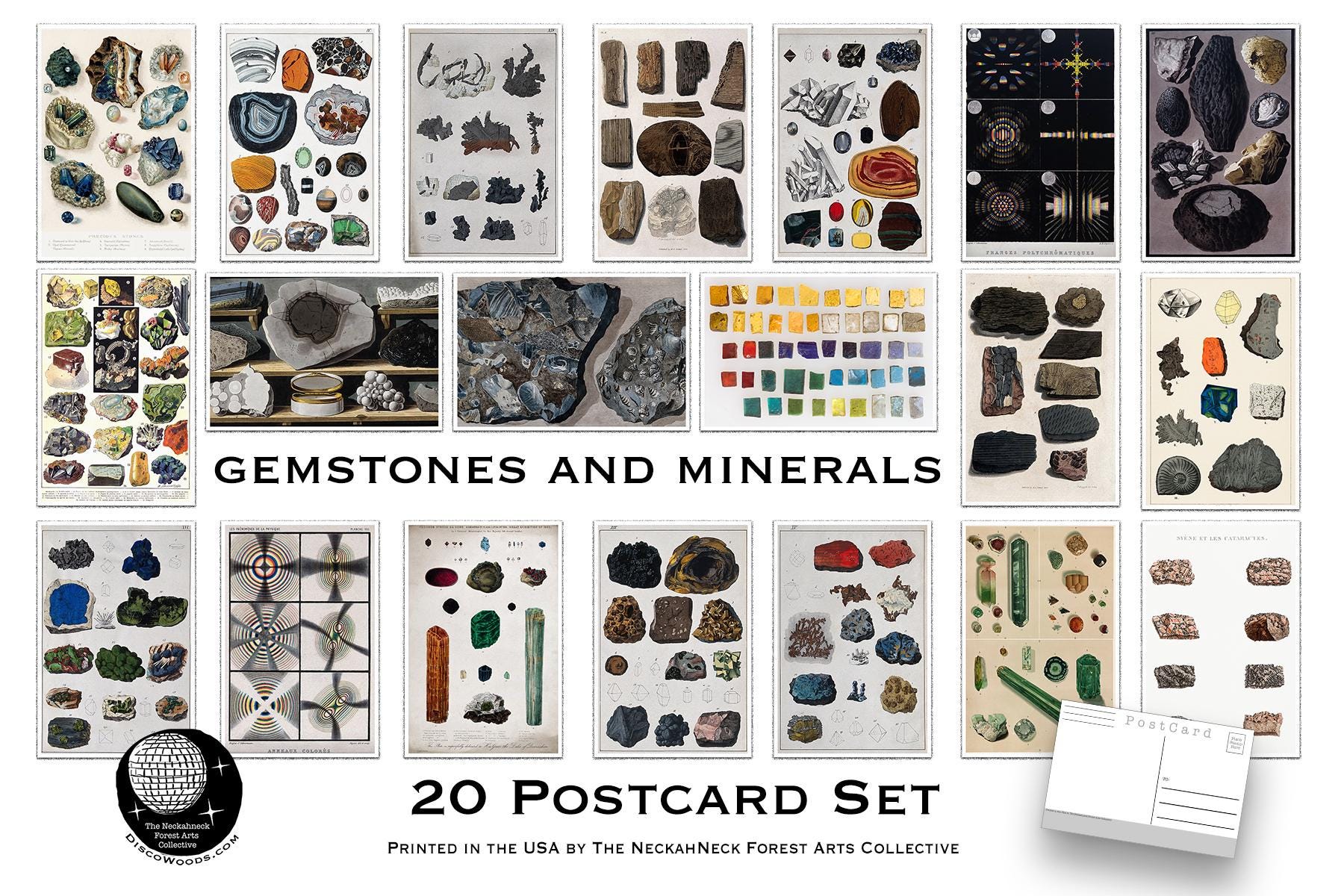 20 distinct designs showcasing detailed illustrations of gems, crystals, and mineral specimens.